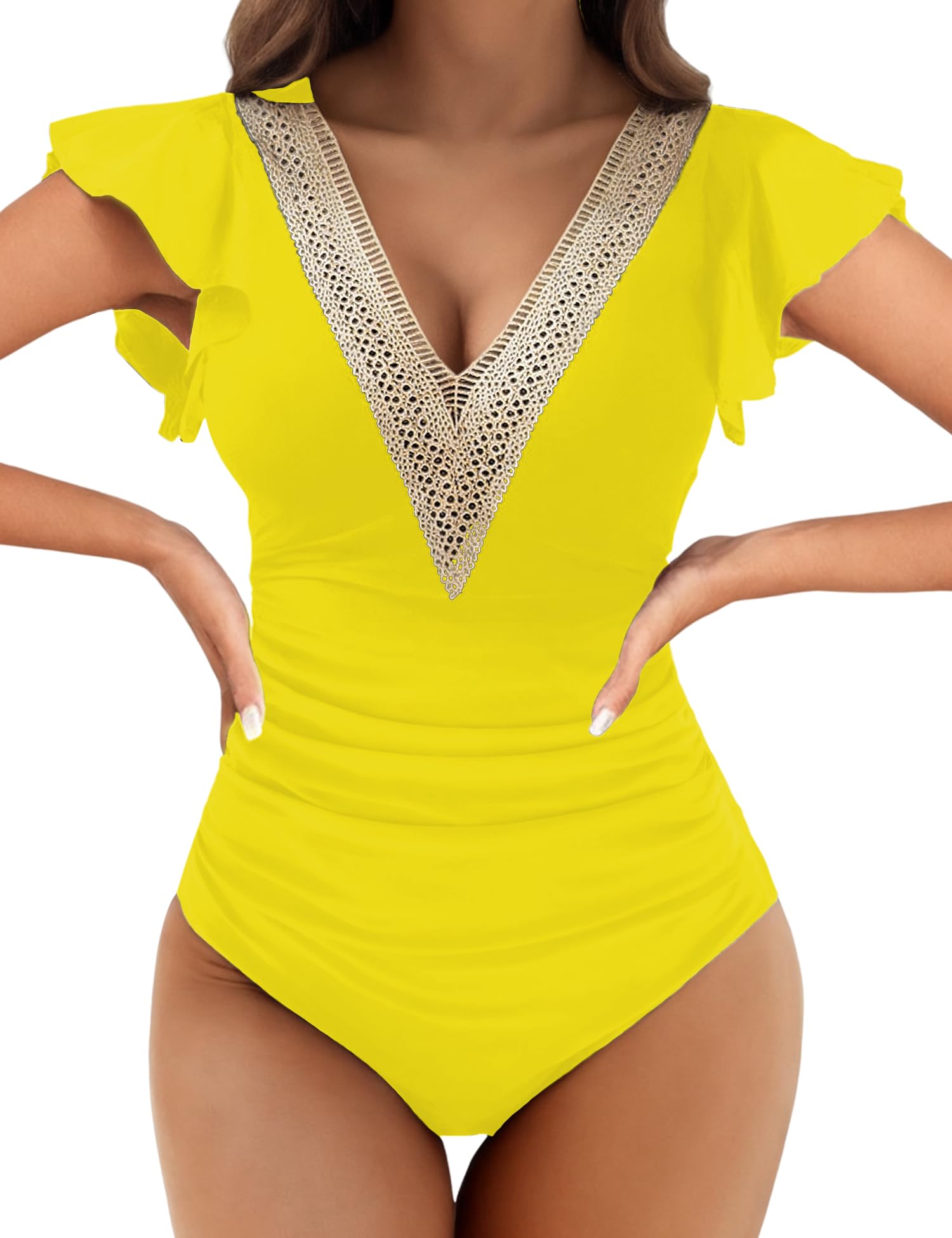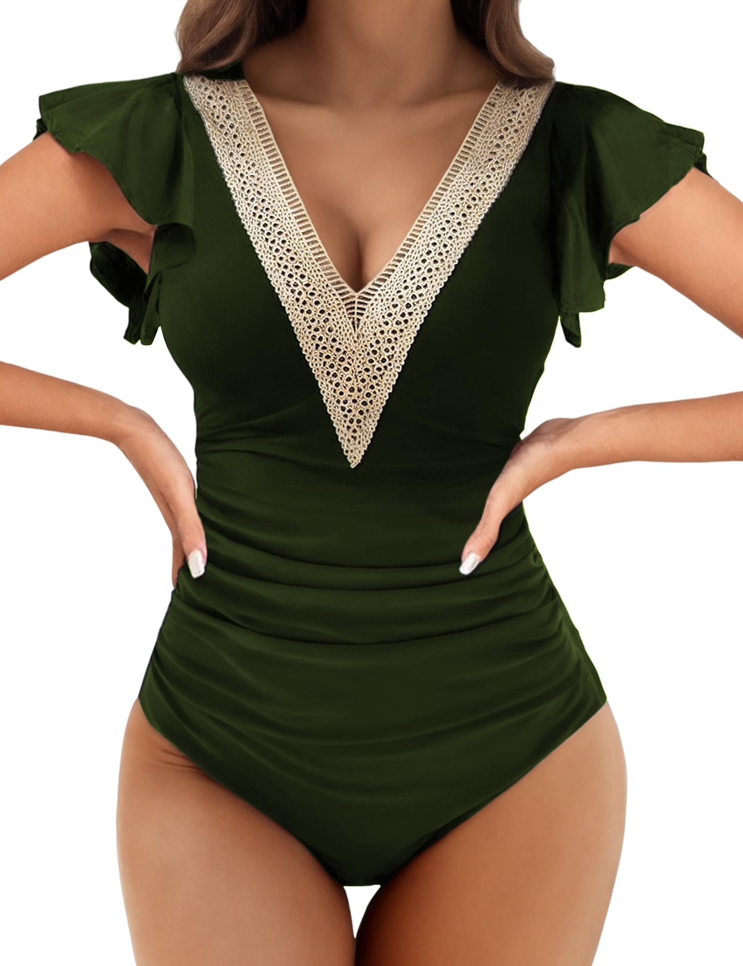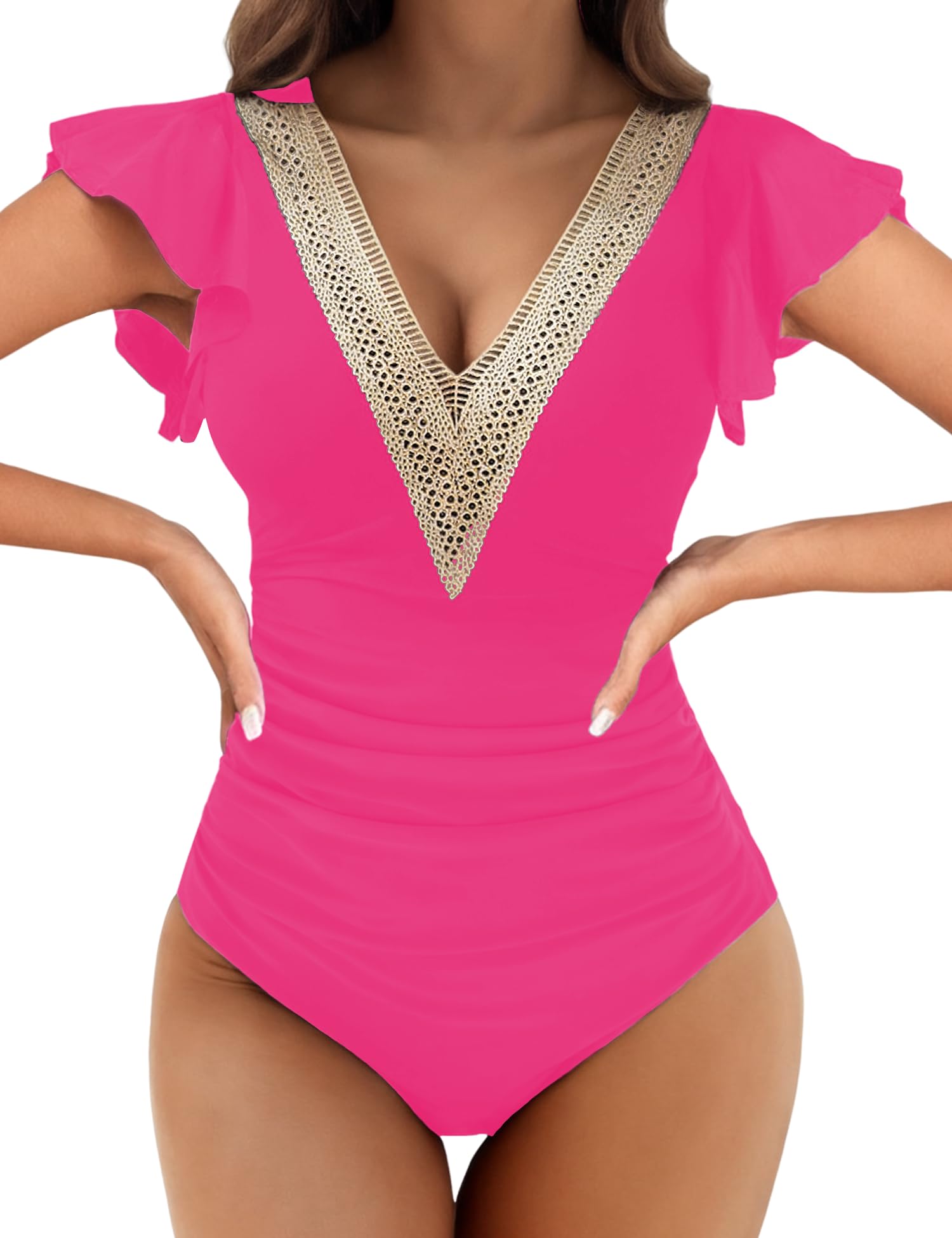 Buauty Womens One Piece Swimsuits Tummy Control Bathing Suits Deep V Lace Neckline Ruffle Swimwear Women 2025