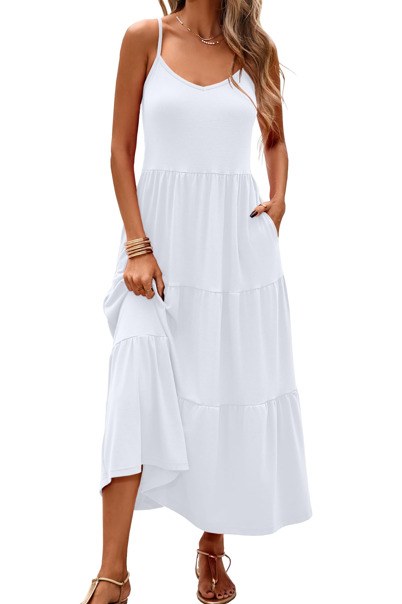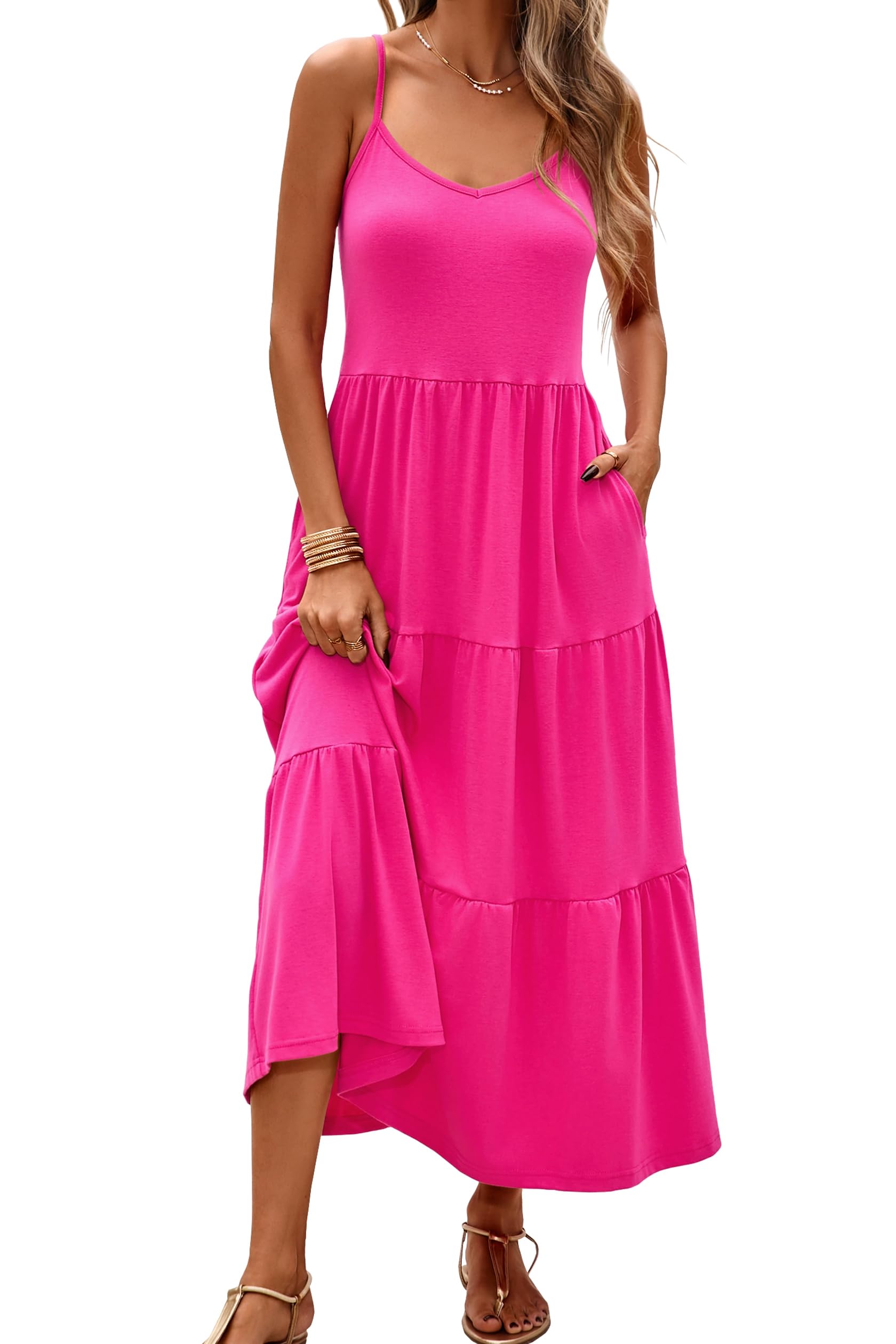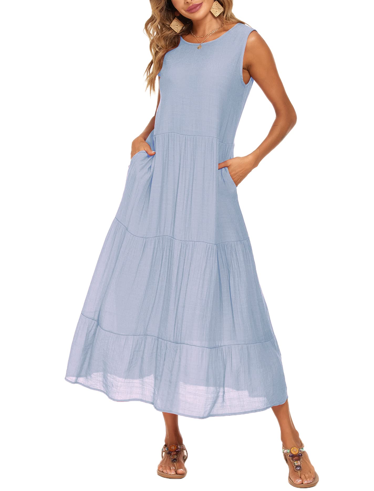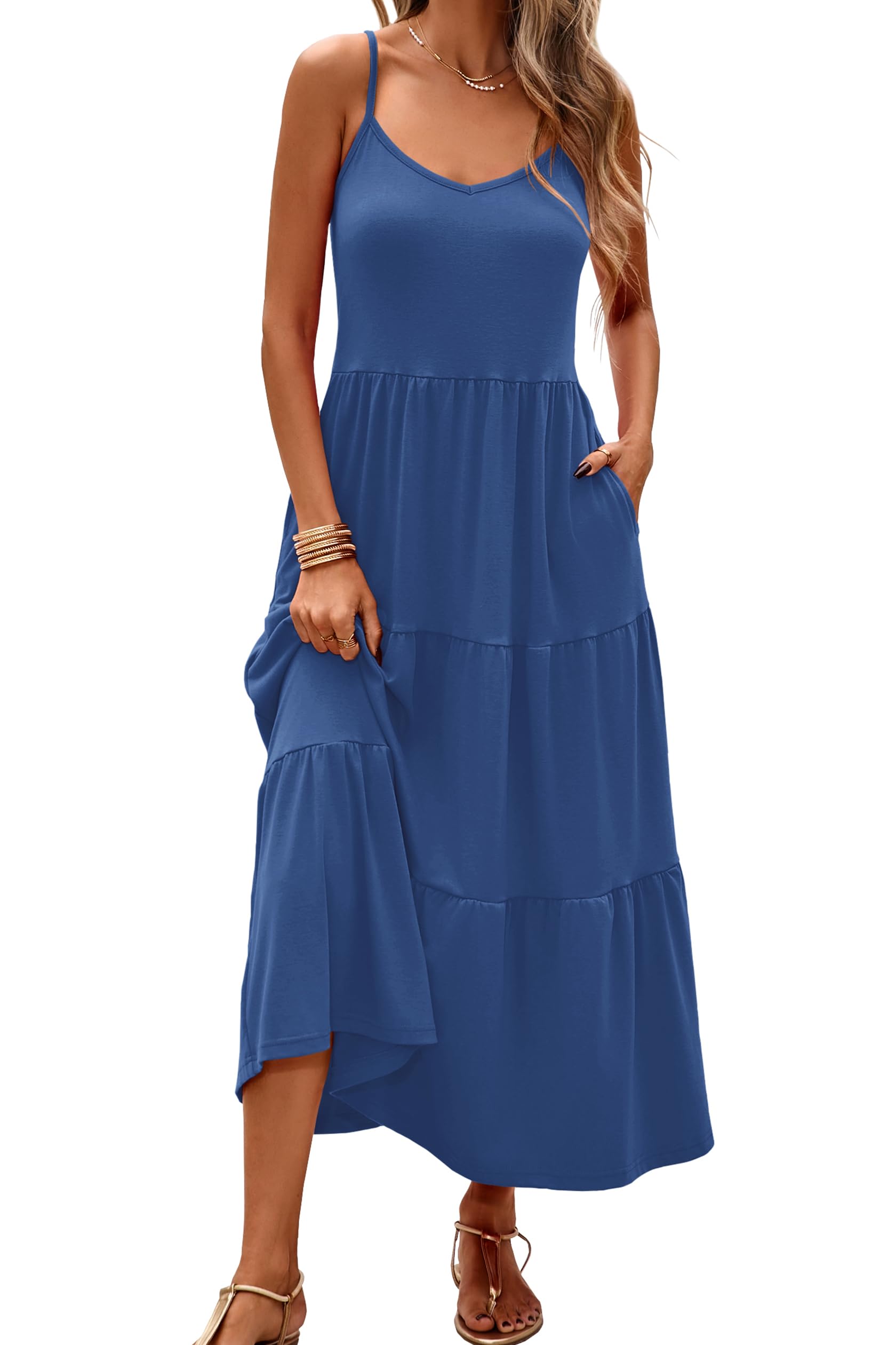 Halife Womens Flowy Tiered Maxi Dress Sleeveless Summer Sundresses Adjustable Straps Long Beach Sun Dresses with Pockets