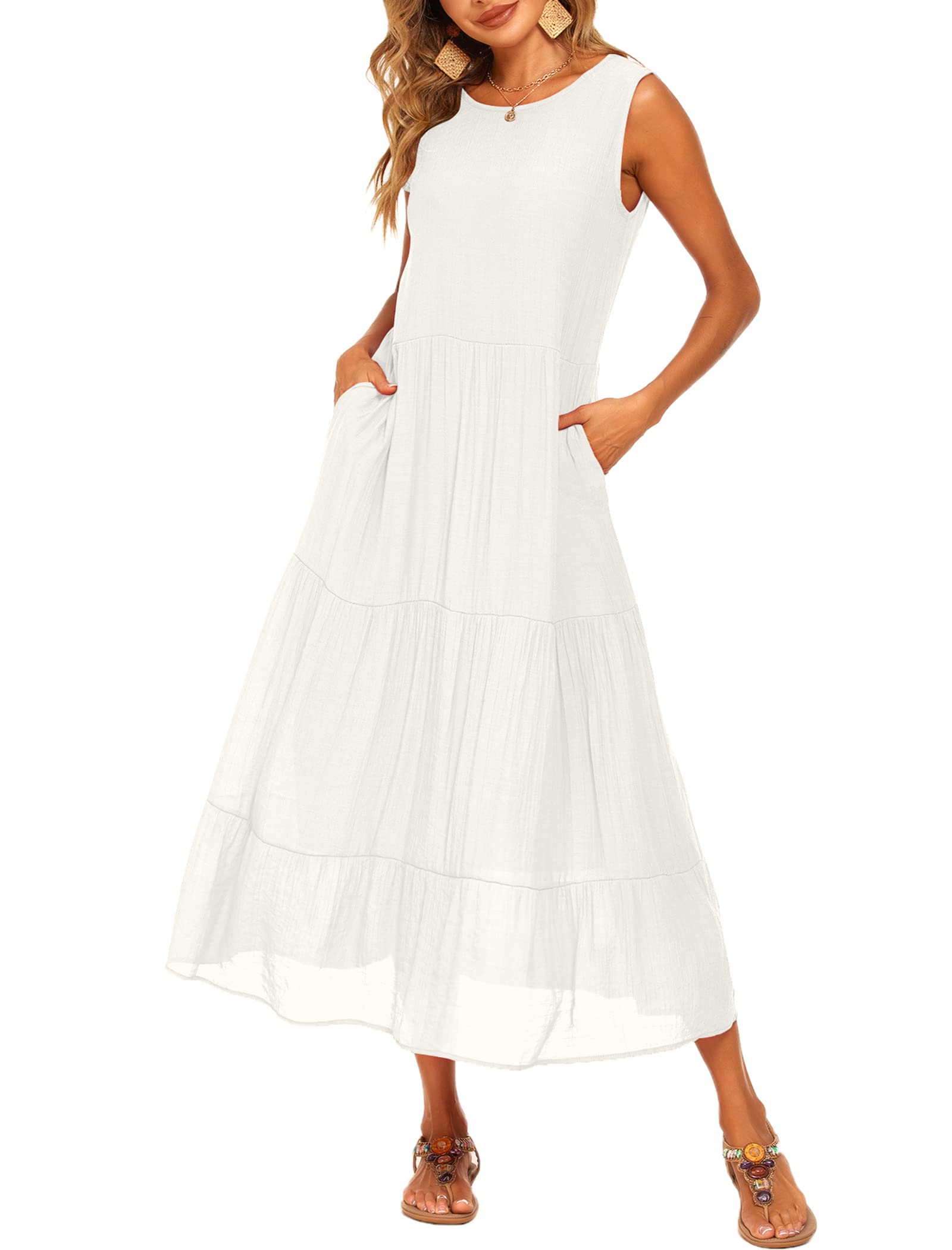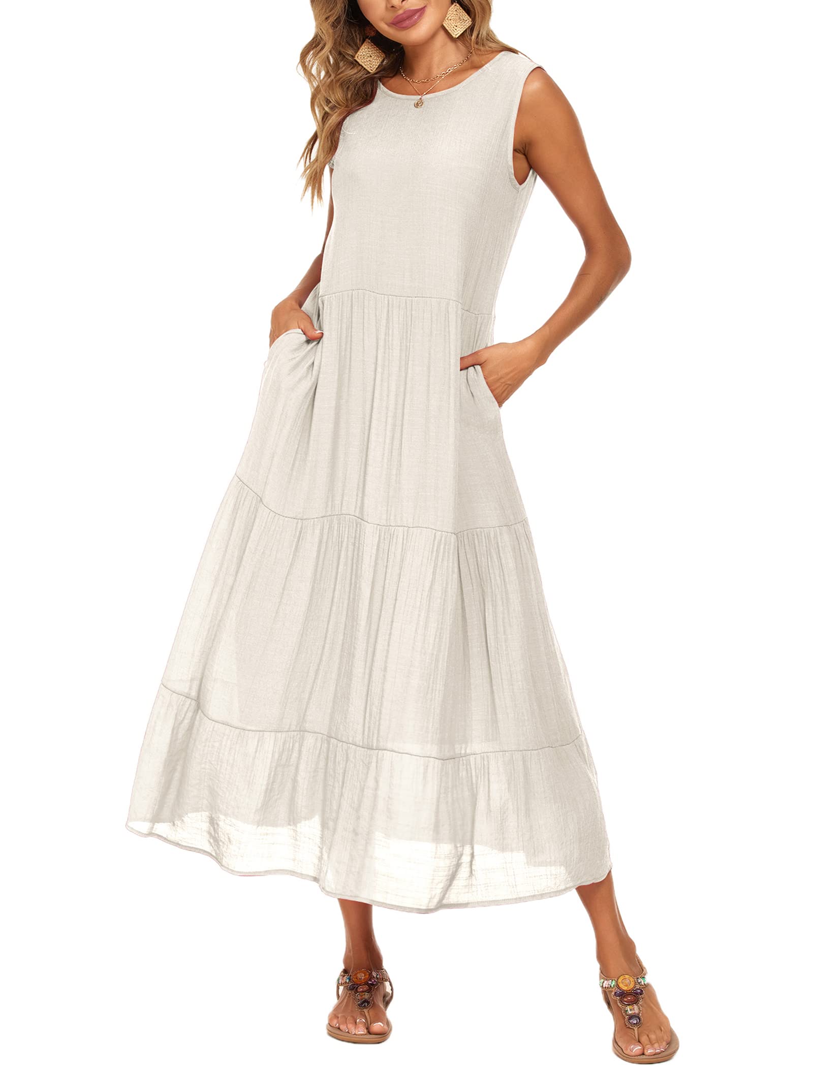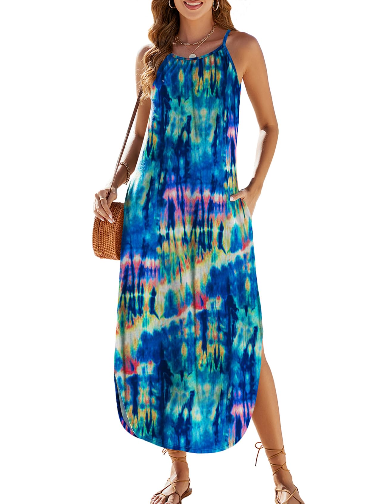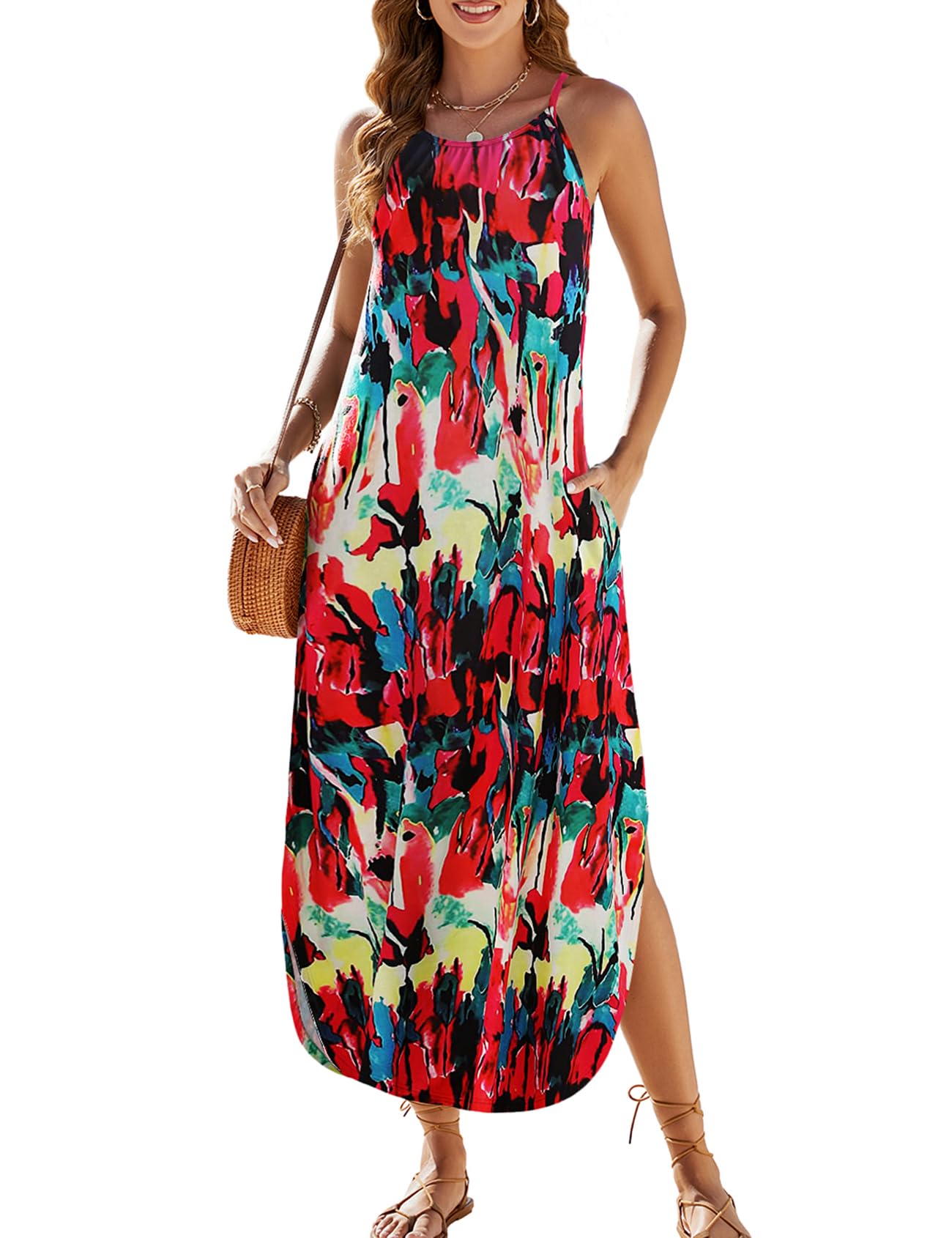 Halife Womens Flowy Tiered Maxi Dress Sleeveless Summer Sundresses Adjustable Straps Long Beach Sun Dresses with Pockets