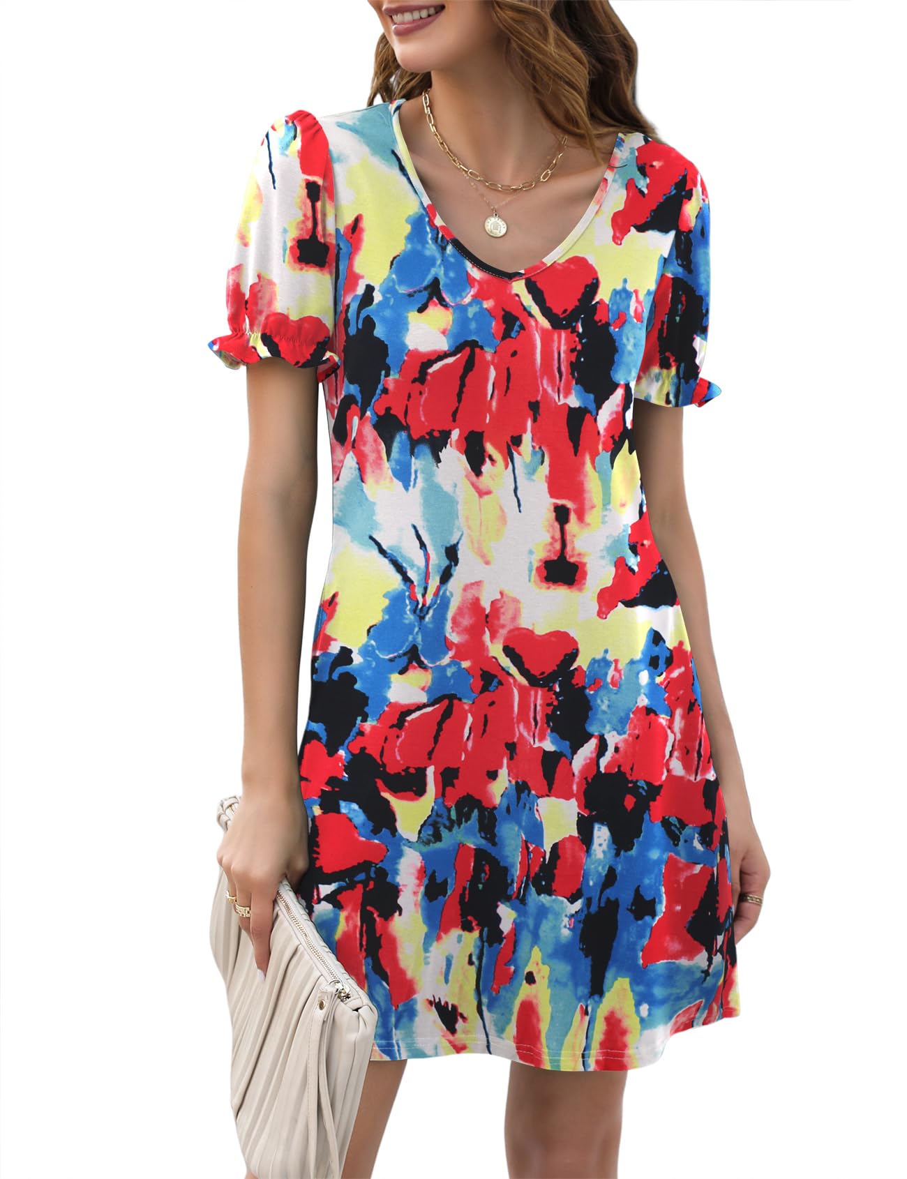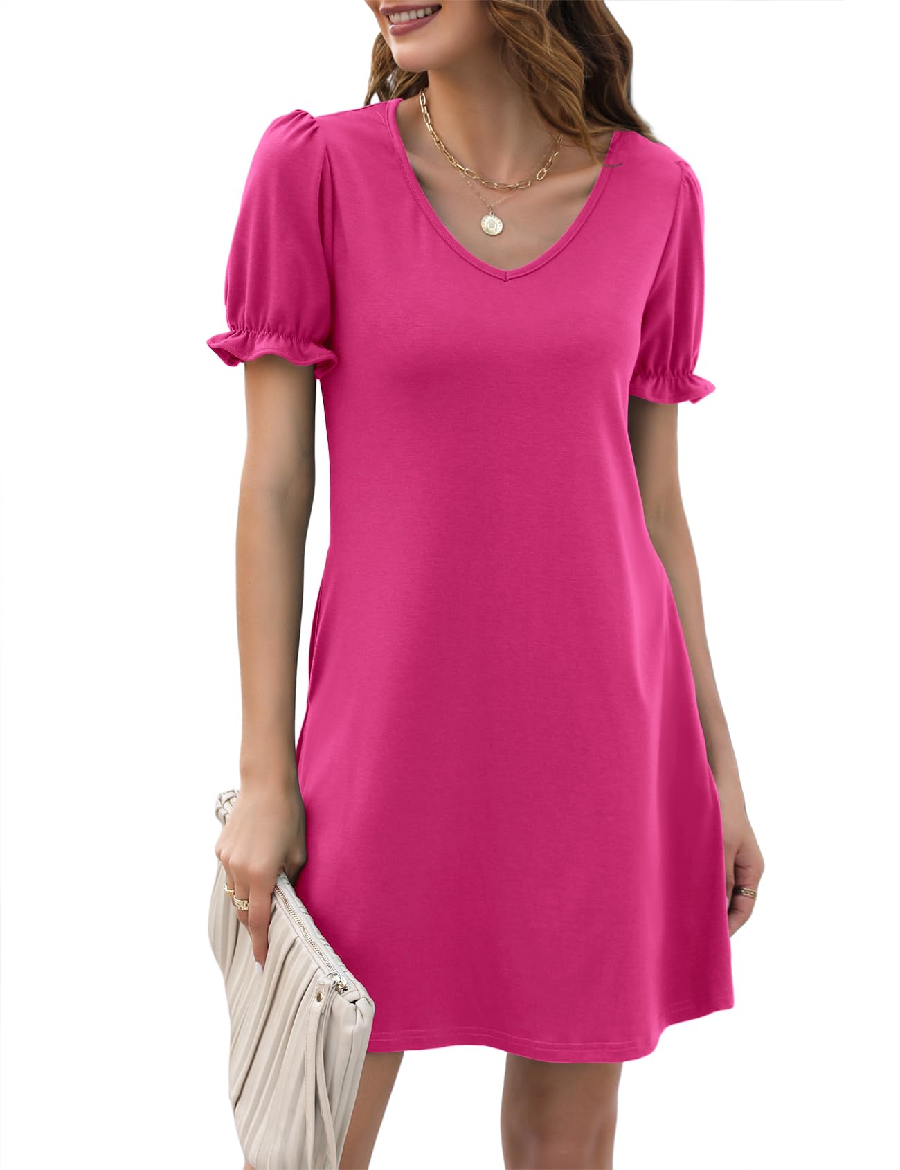 Halife Womens Summer Dresses Casual Puff Short Sleeve V-Neck T Shirt Dress with Pockets