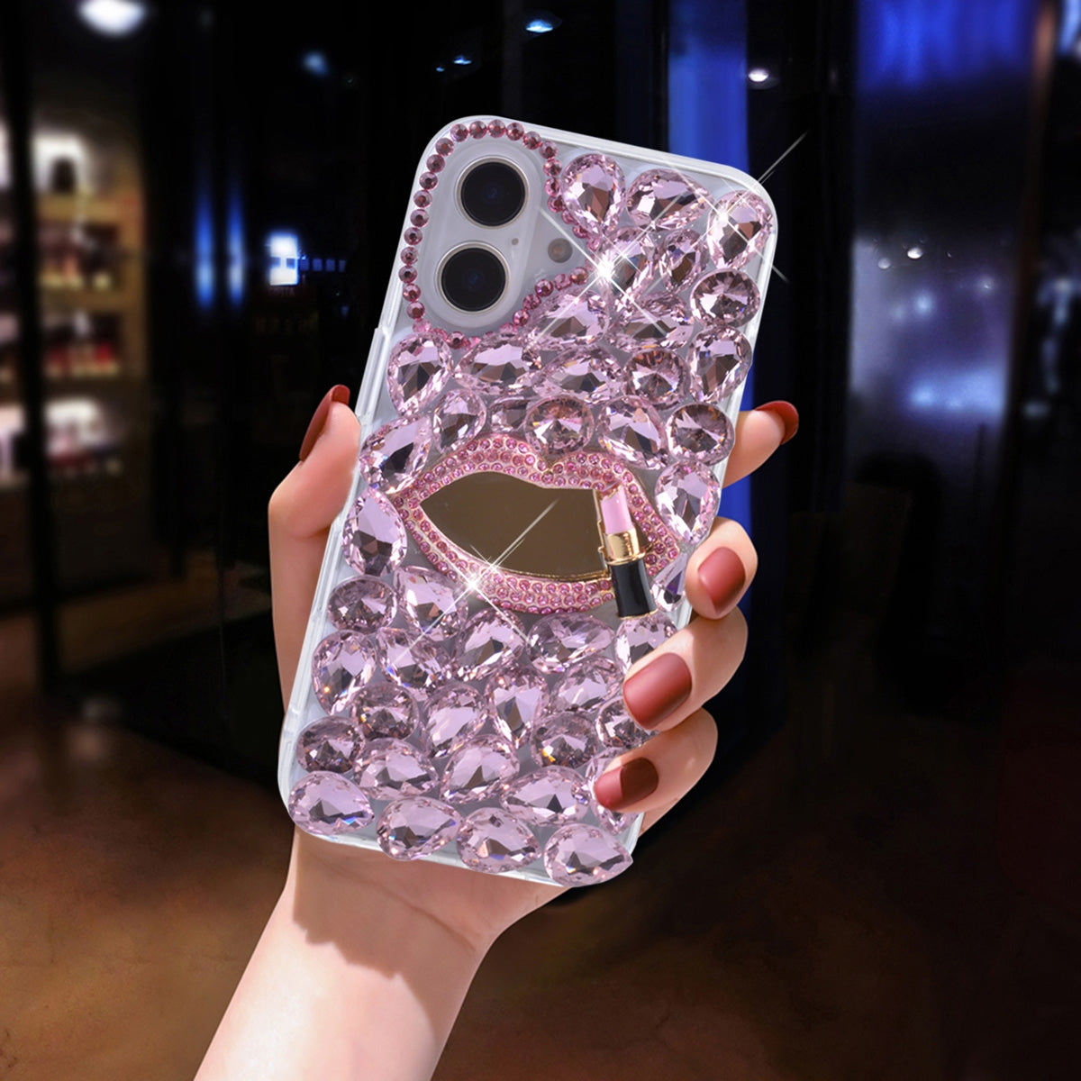 Compatible with iPhone 16 Plus Shiny Crystal Diamond Phone Case, 3D Luxury Lip Makeup (with Mirror) Shiny Crystal Rhinestone Lipstick Case for Girls Women Chil...