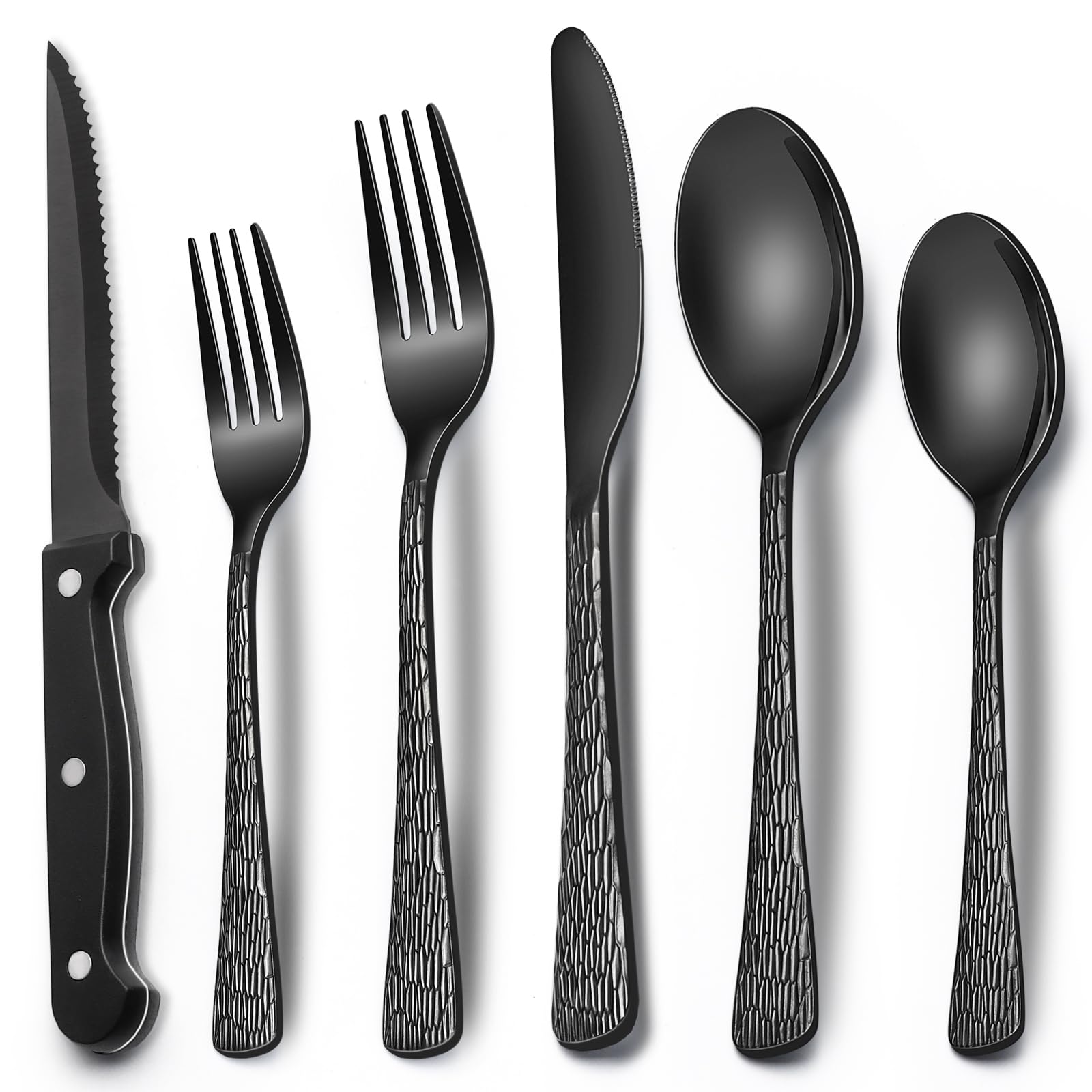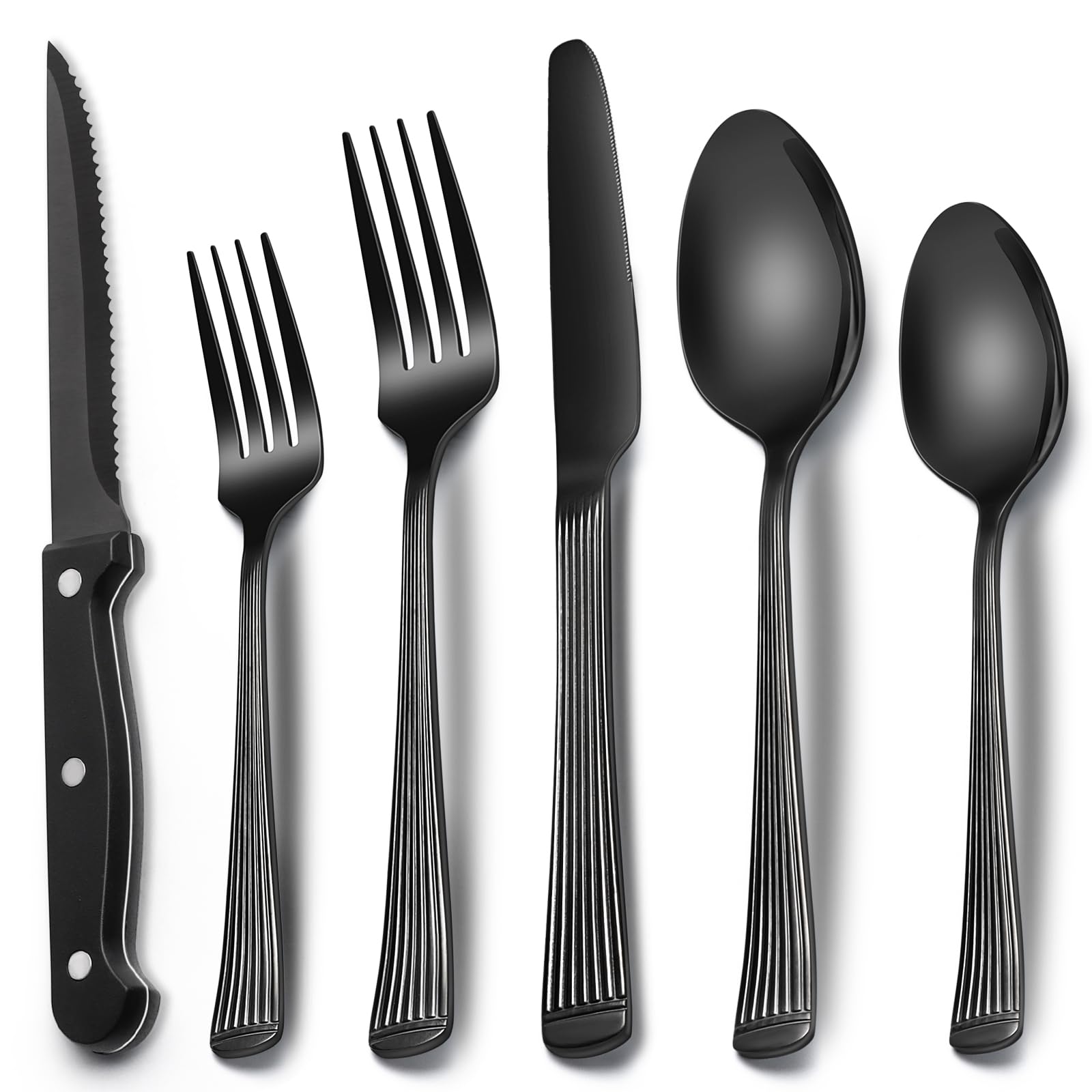24-Piece Black Silverware Set with Steak Knives, Black Flatware Set for 4, Food-Grade Stainless Steel Tableware Cutlery Set, Mirror Finished Utensil Sets for Home Restaurant