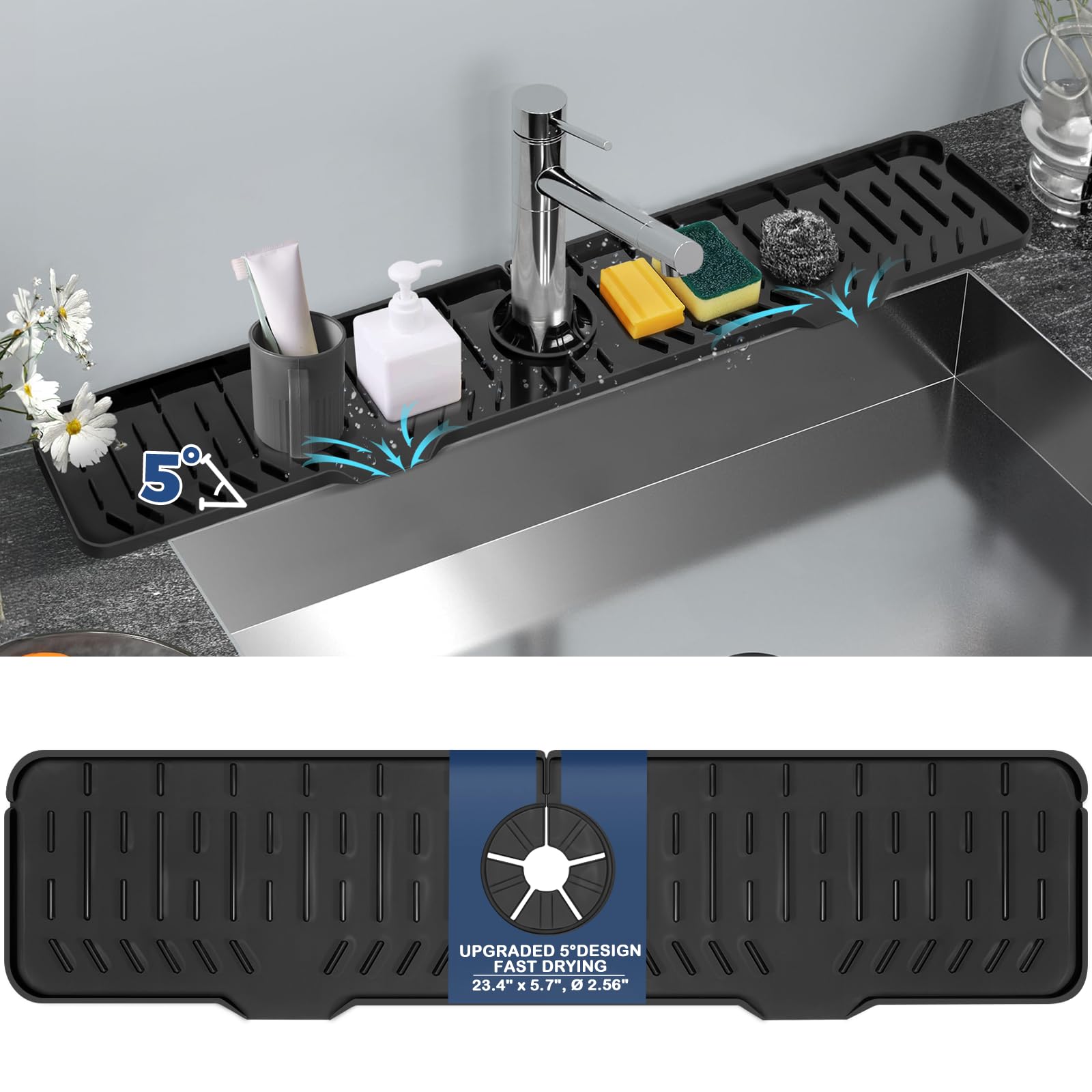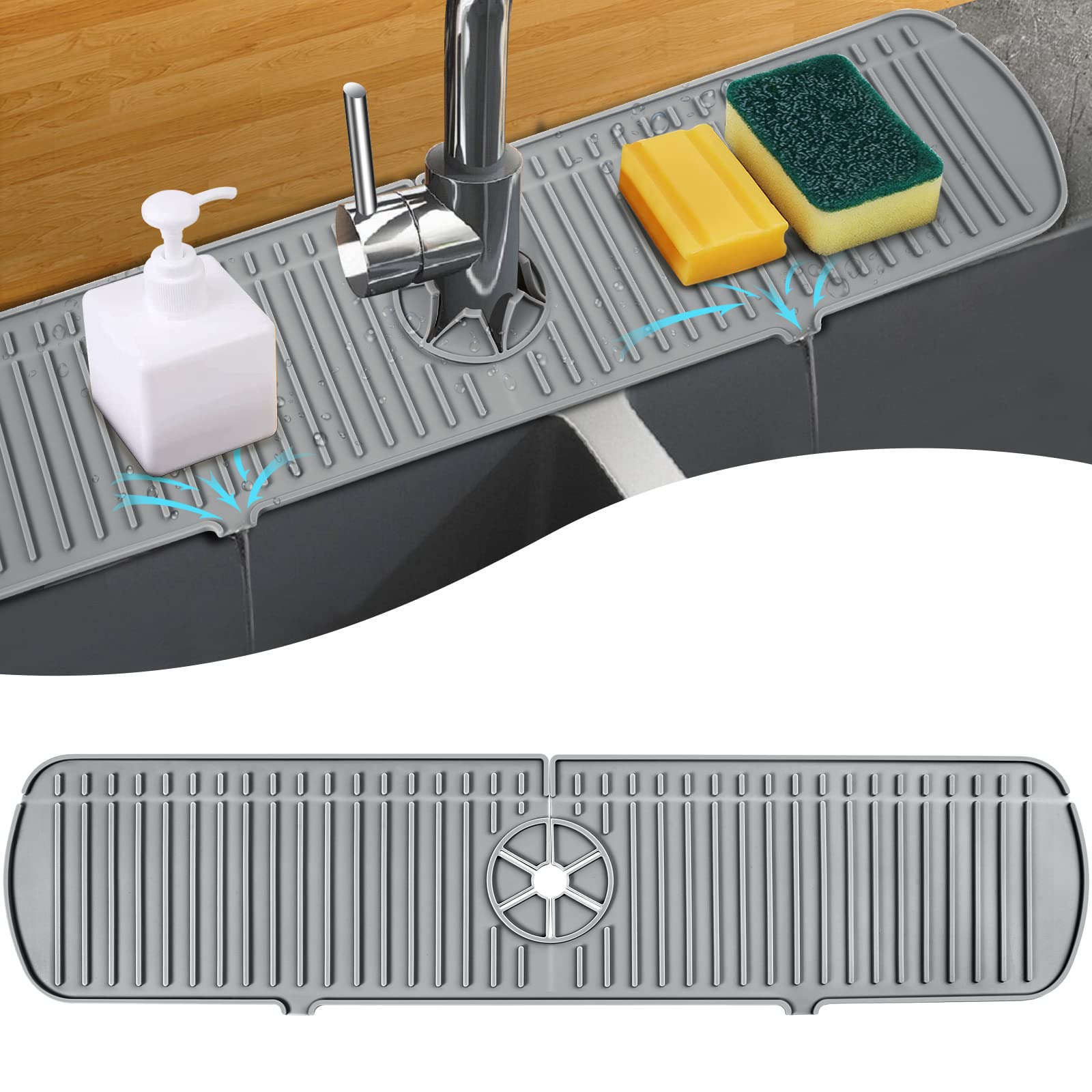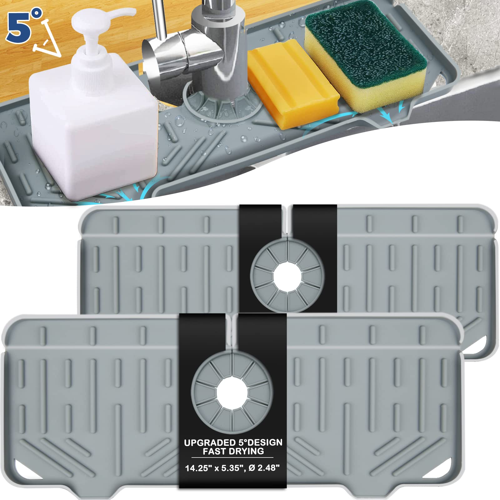 Silicone Faucet Handle Drip Catcher Tray Mat, Silicone Faucet Mat Dish Soap Sponge Holder for Kitchen Sink Accessories Gadgets, Drying Mat for Kitchen Counter Bathroom Kitchen Sink Splash Guard -Grey