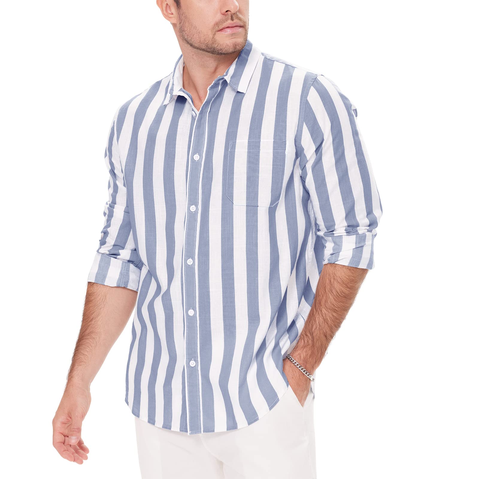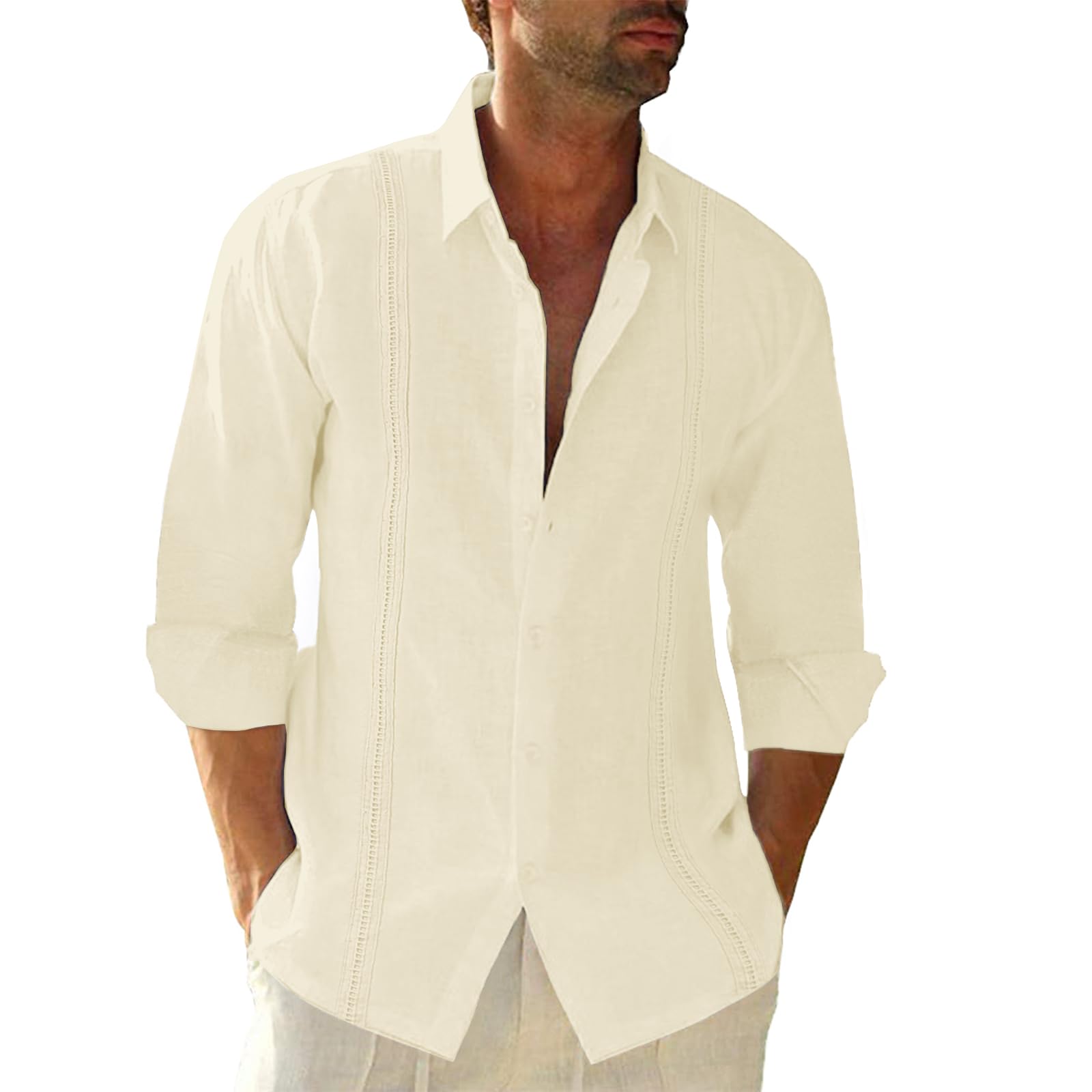 Button Down Linen Shirts for Men Casual Long Sleeve Regular Fit Cotton Beach Shirts with Pocket