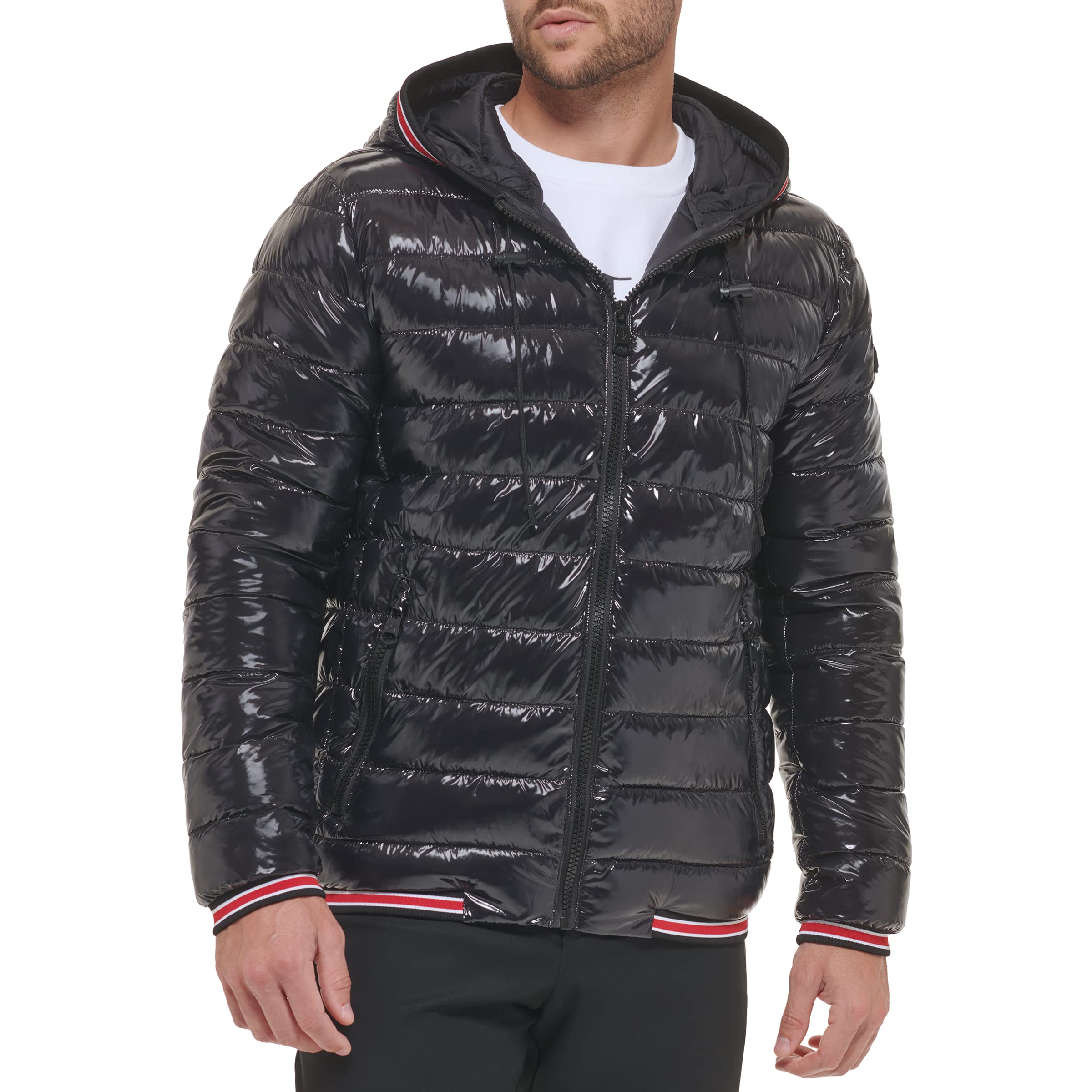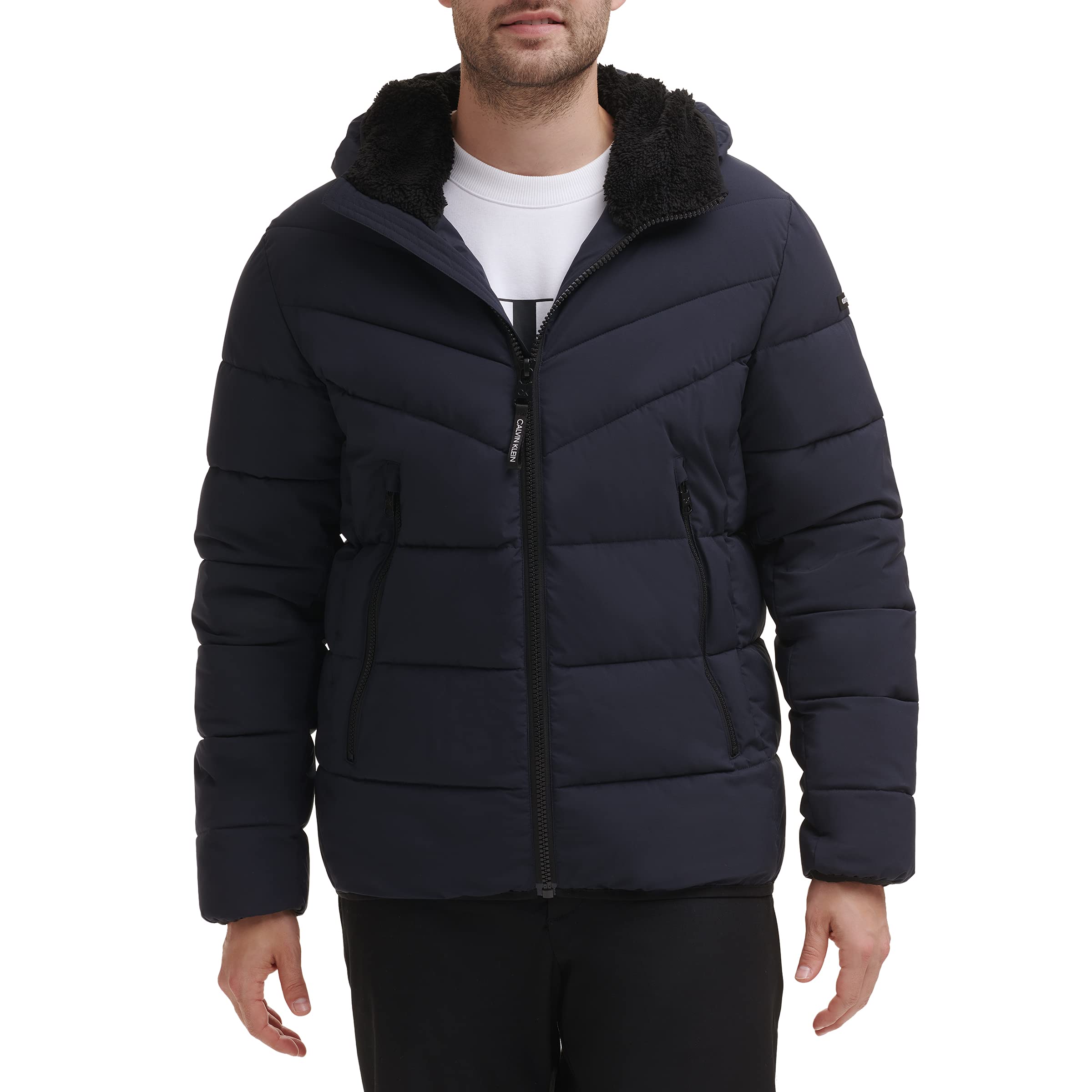 Calvin Klein men's stretch, sherpa lined hood jacket with quilt detailing.