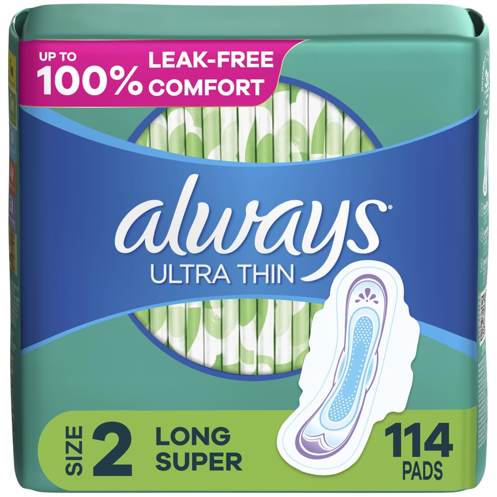 Always Ultra Thin Feminine Pads For Women, Size 2 Long Super Absorbency, With Wings, Unscented, 58 Count