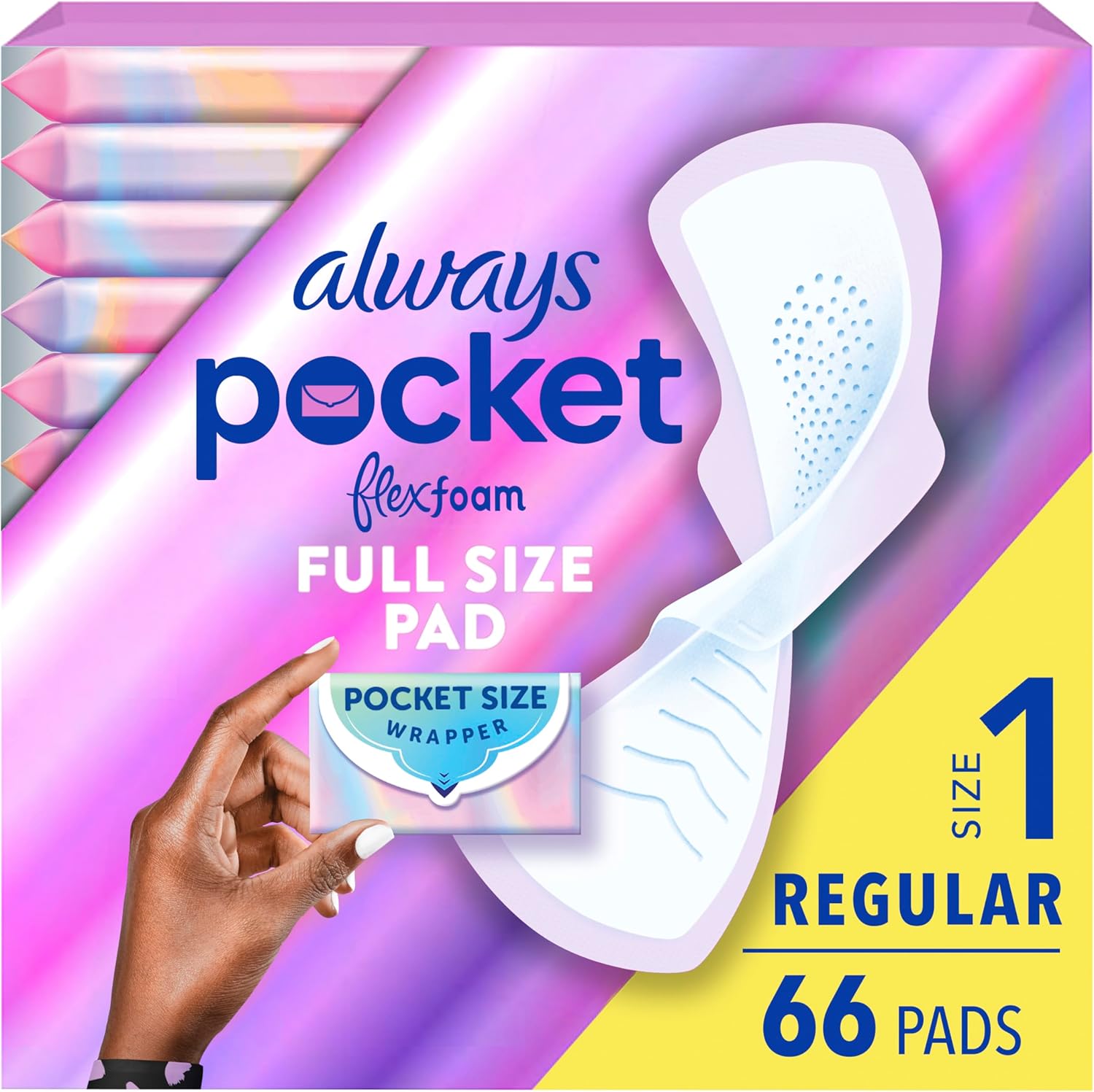Always Pocket Feminine Pads for Women with FlexFoam, Size 1, Regular, with Wings, Unscented, 66 Count