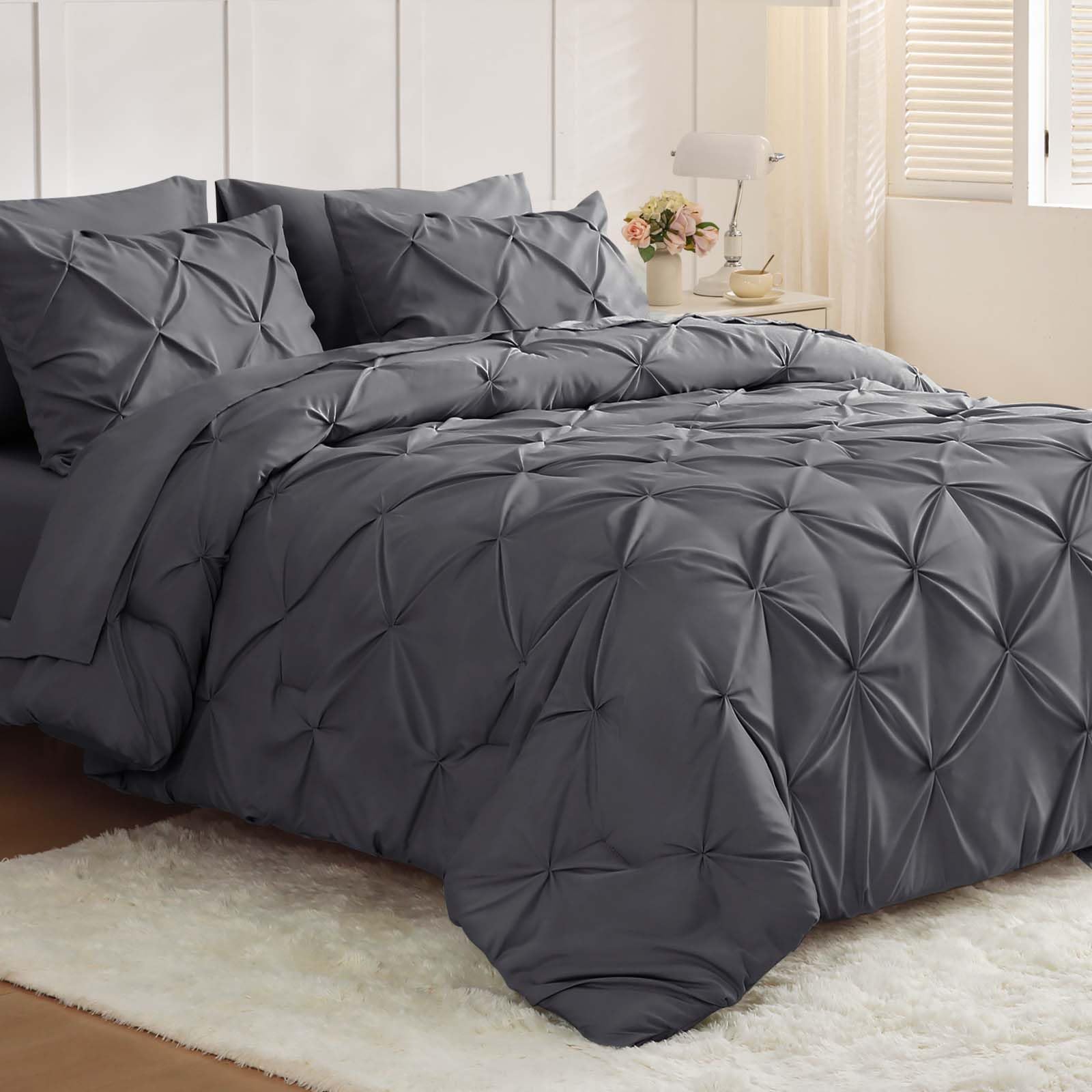 JOLLYVOGUE Queen Comforter Set 7 Pieces - Bed in a Bag Queen for All Season, Pintuck Bedding Comforter Sets with Comforter, Flat Sheet, Fitted Sheet and Pillowcases & Shams, Black