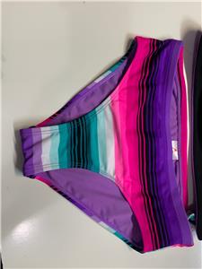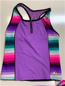 Gerry 3-piece swim set. One tankini top with two bottoms, a traditional bikini style bottom and also boy shorts style bottoms. The tankini top has a front zipper that opens and has a modesty panel. The back racerback straps are perforated/mesh. The color is more lilac purple, as in the one model photo. size 12.