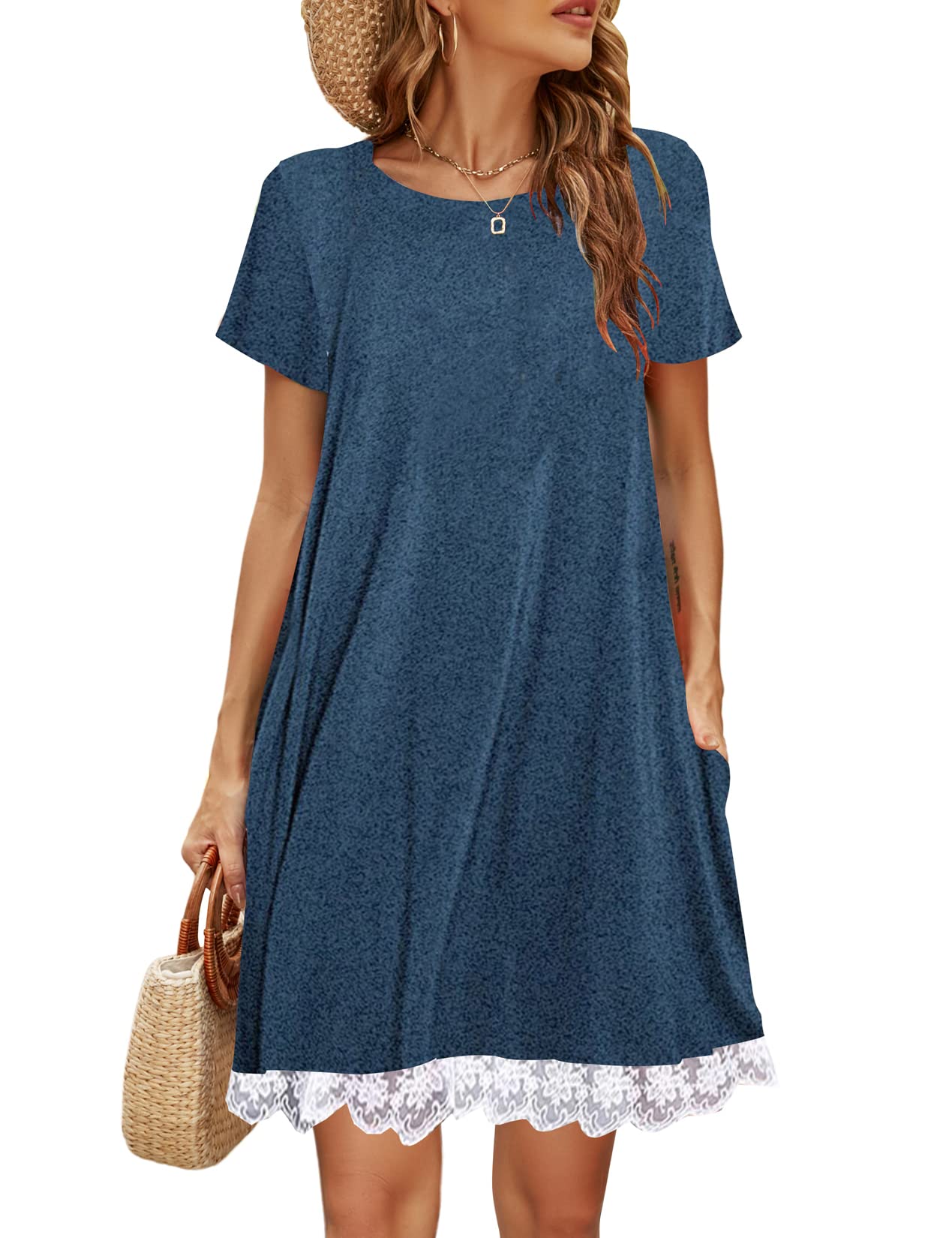 Halife Womens Summer Casual Tshirt Dress Loose Lace Hem Short Sleeve Beach Sundresses with Pockets