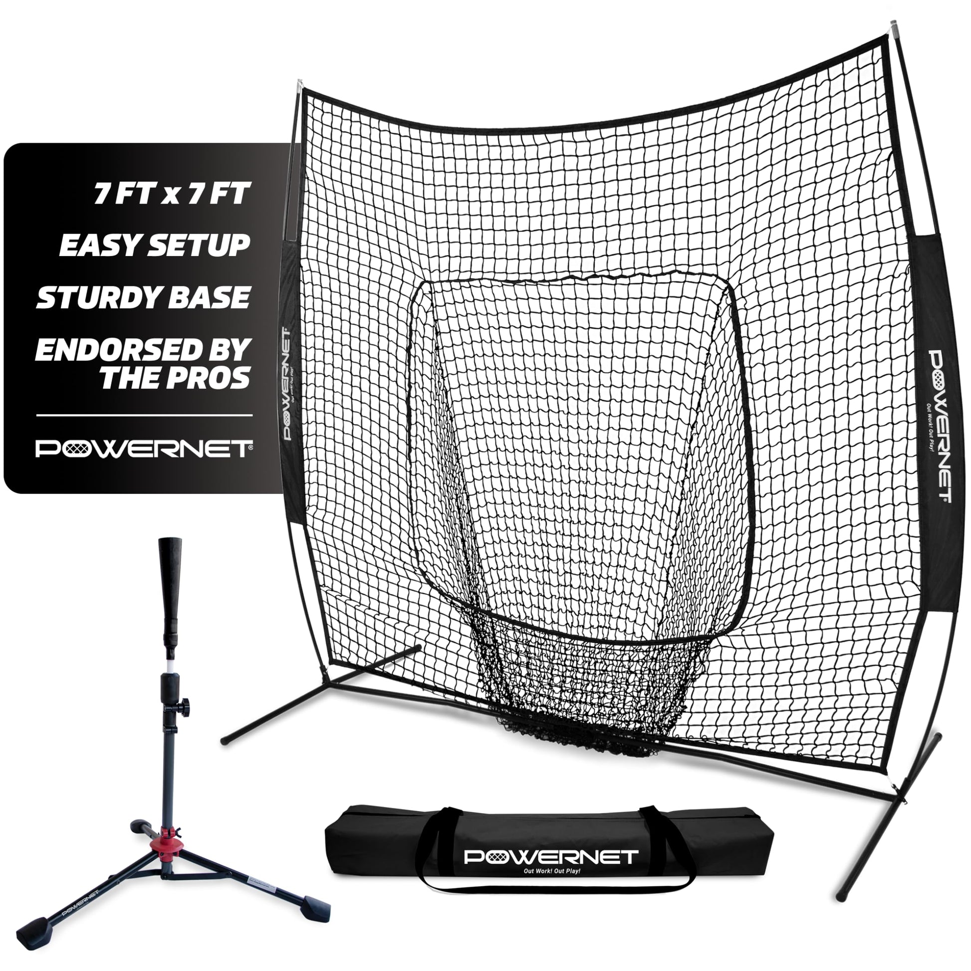 - BLACK 7 X 7 FT BASEBALL NET: This 7x7 foot practice net is a portable solution for baseball and softball training. The net holds multiple buckets of balls, allowing continuous training. The sturdy bow-style frame provides 49 sq. ft. of hitting surface. Includes ground stakes and a heavy-duty carry bag with a shoulder strap