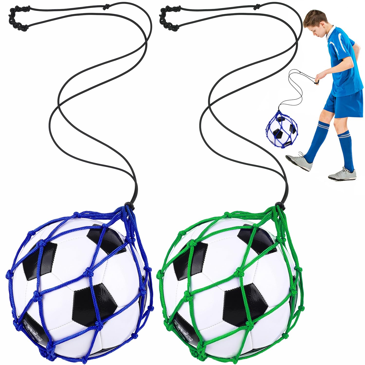 TOBWOLF 2PCS Football Kick Trainer, Soccer Return Trainer Net Fits Ball Size 3, 4, 5, Hands-Free Football Kick Throw Solo Practice Training Aid, Adjustable Waist Belt Soccer Ball Trainer Net